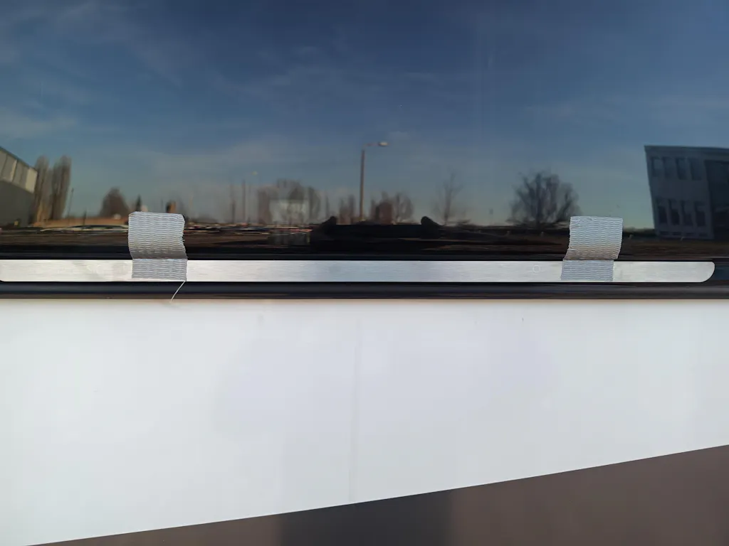 WOMO-RK is made of 2 parts and is firmly glued to the acrylic glass pane - it is pre-equipped with high-performance adhesive tape. The panel on the front serves to equalize tension and act as a deterrent. The WOMO angles for securing are always included in the delivery.