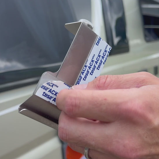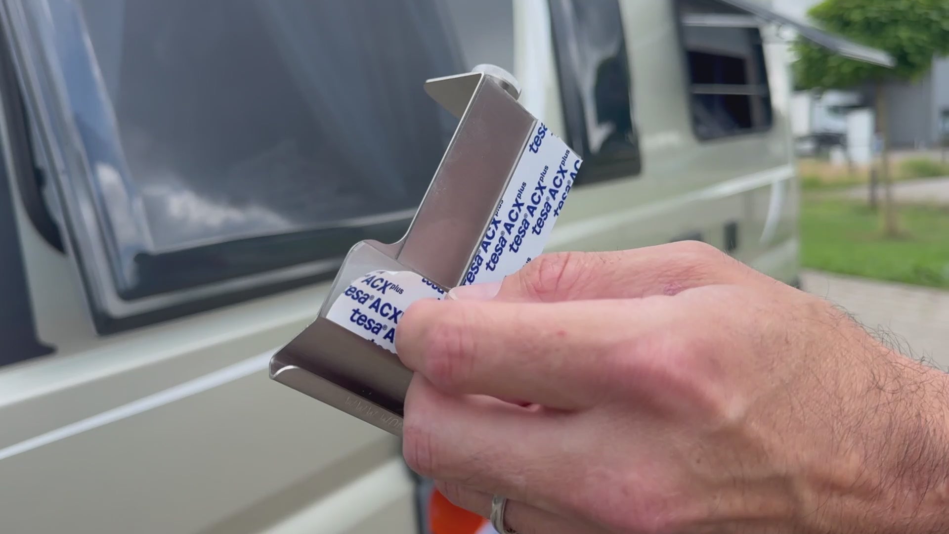 WOMO-AK ist das Sicherheitsprofil für vorgehängte rahmenlose Fenster mit großem Überhang. Der Abstand von der Fensterunterkante bis zur Unterkante der Verriegelung ist hier größer als 60mm. Das System wird von unten auf die Acrylglasscheibe aufgesteckt und von innen verklebt - es ist hierzu mit Hochleistungsklebeband ausgerüstet.